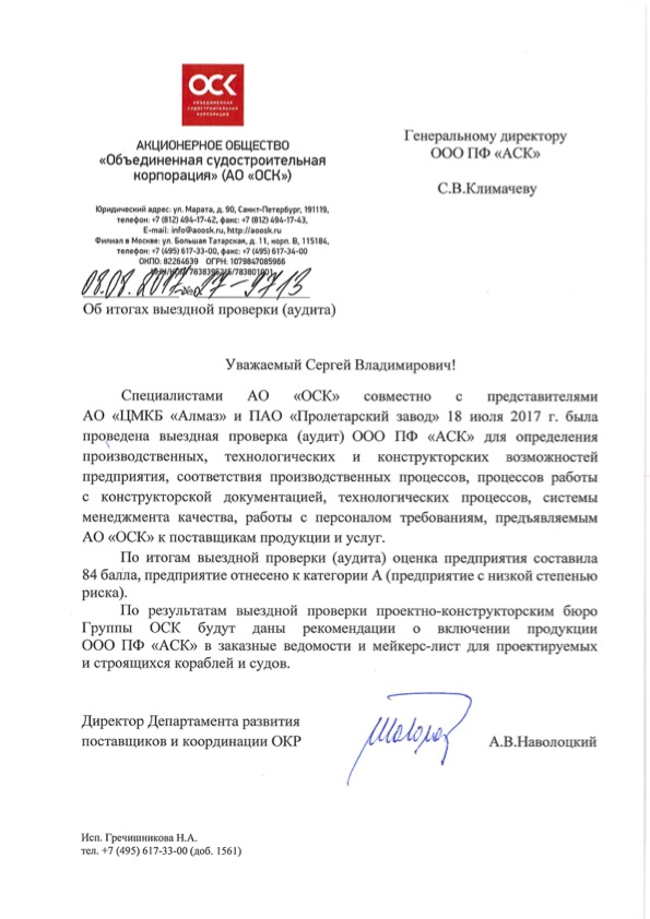 По итогом выездного аудита ПФ "АСК" получила высокую оценку АО «Объединённая судостроительная корпорация» и было отнесено к категории А (предприятие с низкой степенью риска)