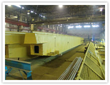 Запущены в эксплуатацию автоматы для сварки угловых и продольных швов пролетных балок мостовых кранов. Сварка балок ведется одновременно с двух сторон в автоматическом режиме. Сварочные агрегаты осуществляют быструю и высококачественную сварку крановых пролетных балок длиной до 30 метров. При производстве сварных соединений на сварочных автоматах значительно улучшились такие характеристики сварного шва, как: плотность, чистота поверхности, равномерность катета по всей длине. Из-за обеспечения одинакового и постоянного режима сварки одновременно с обеих сторон балки снизилась деформация металлоконструкции, что позволило перейти от технологии "обратно-ступенчатой" сварки от центра балки к краям на более производительную сварку "на проход" от одного края изделия до другого. Кроме того, снижение влияния человеческого фактора привело к повышению устойчивости производственно-технологической цепочки изготовления мостовых кранов. В процессе производства кранов используются сварочные автоматы для сварки встык поясов пролетной балки крана. Данные агрегаты созданы по собственному проекту. Применение прогрессивных методов сварки, значительная автоматизация процесса, строгий контроль за соблюдением технологий, аттестованных Национальной Ассоциацией Контроля и Сварки под требования РОСТЕХНАДЗОРА, постоянное их совершенствование с учетом мирового опыта, обеспечивают стабильное высочайшее качество сварки, а значит, и продукции в целом. Концевые балкиКран передвигается на концевых балках, каждая из которых имеет пару катков, один приводной и один холостой.
